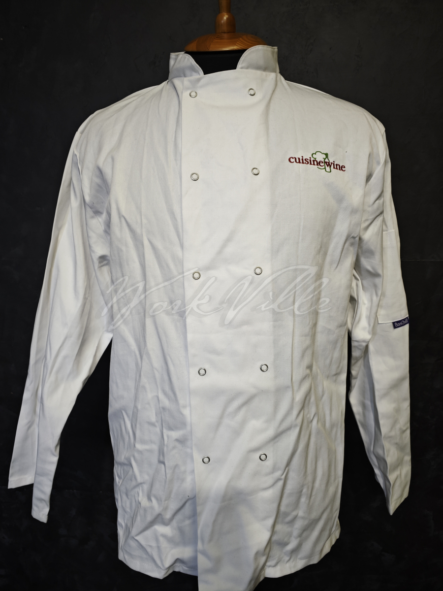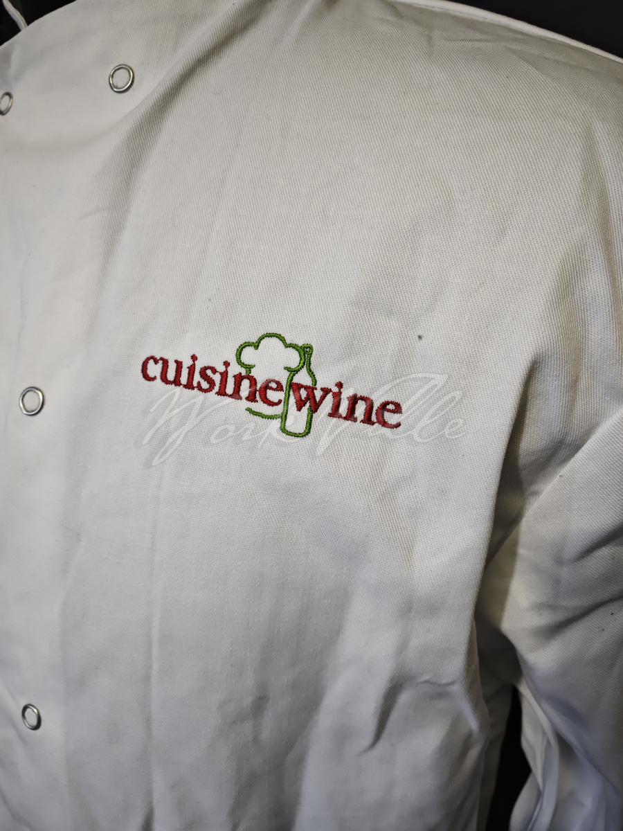 Два ряда плоских кнопок, слева на груди вышивка: cuisine wine.