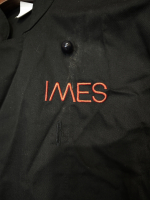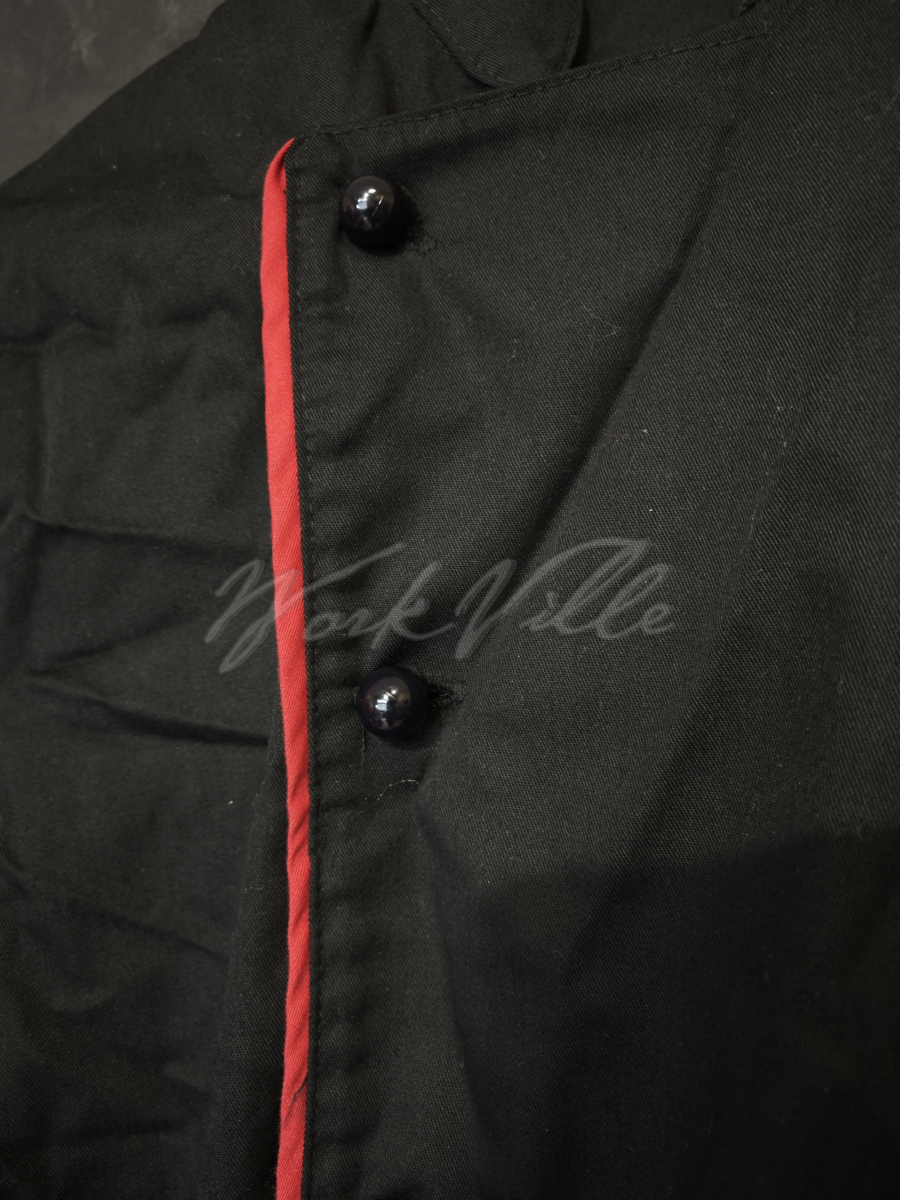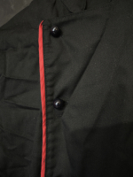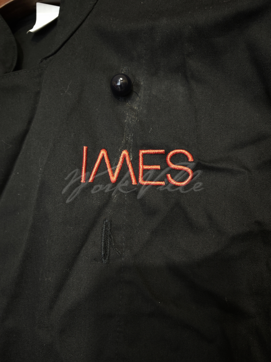 Черный китель повара с красной окантовкой и логотипом IMES.