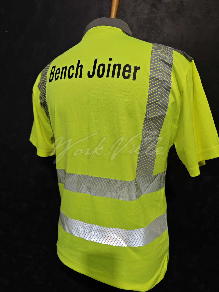 Сигнальная футболка-поло Leo Workwear ярко -желтого сигнального цвета со светоотражающими полосами.