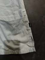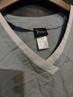 Короткий рукав, два накладных кармана спереди, вертикальные выточки по спинке.