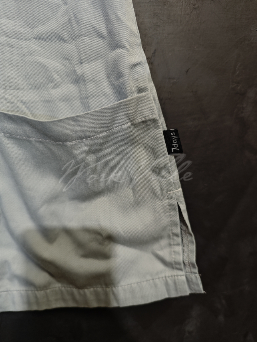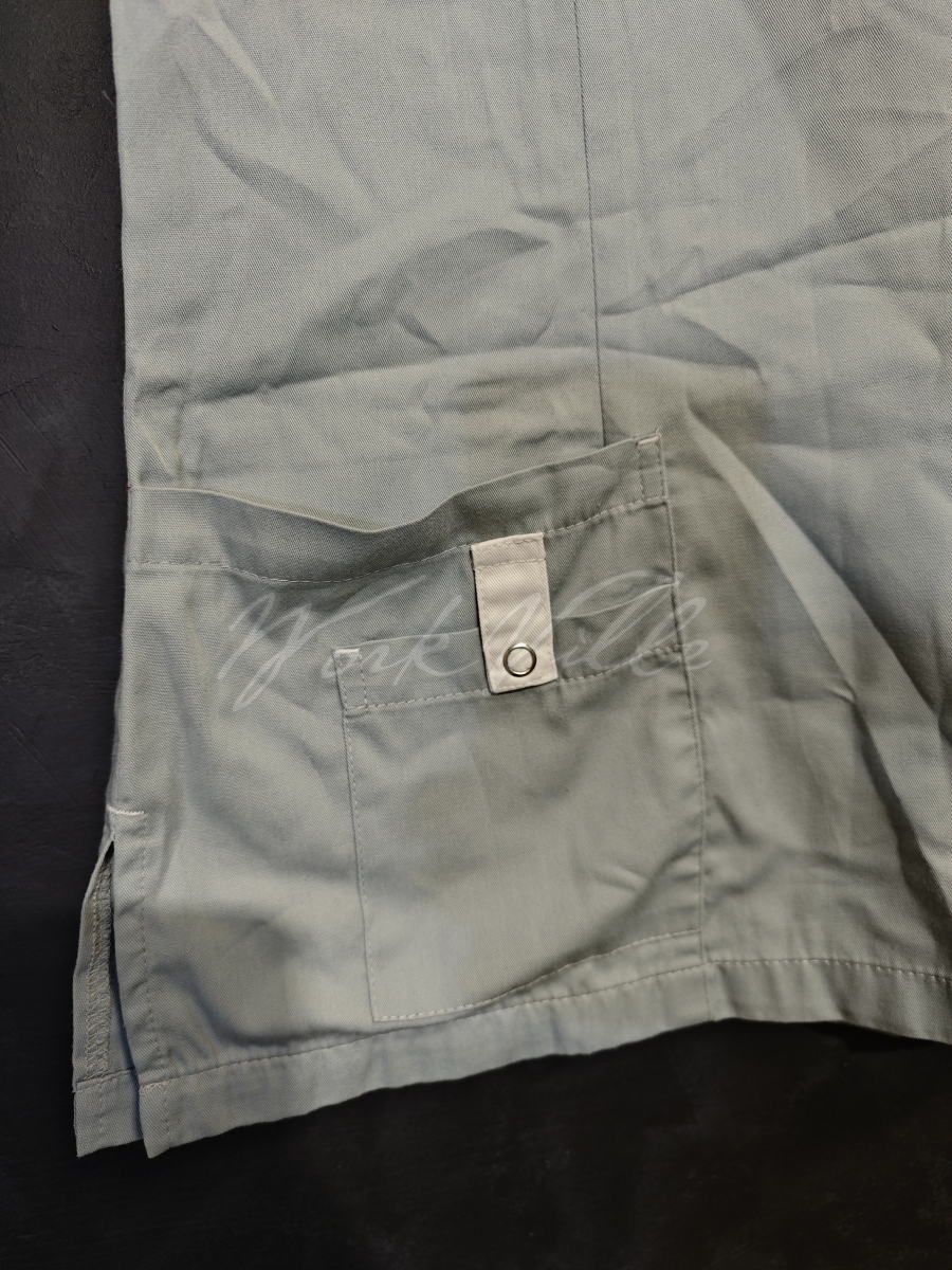 Короткий рукав, два накладных кармана спереди, вертикальные выточки по спинке.