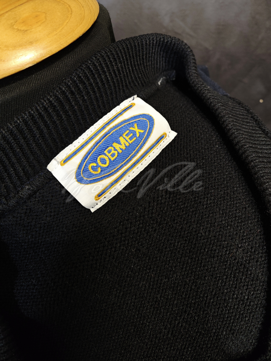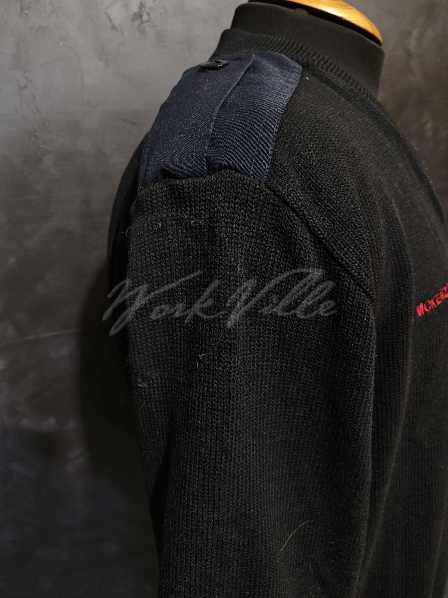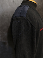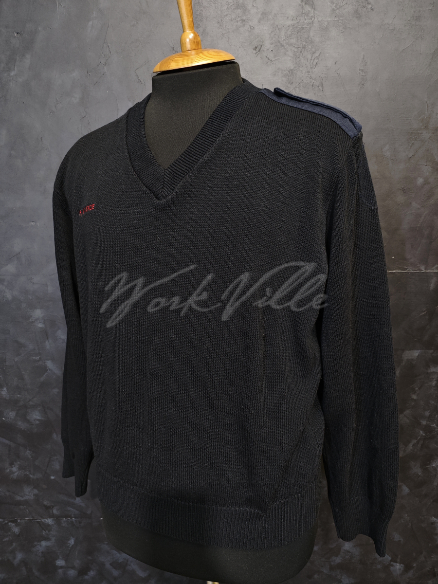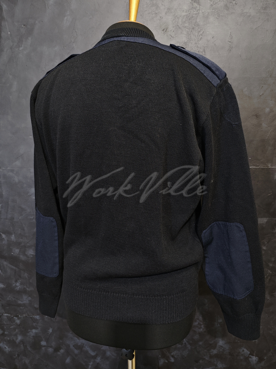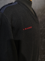 Пуловер черный с V-образным горлом и темно-синими накладками.
