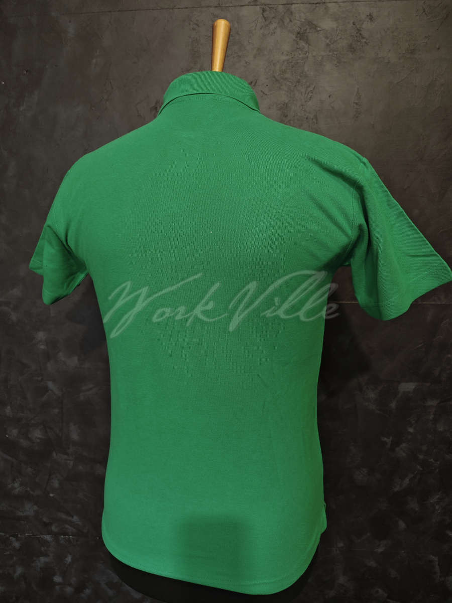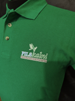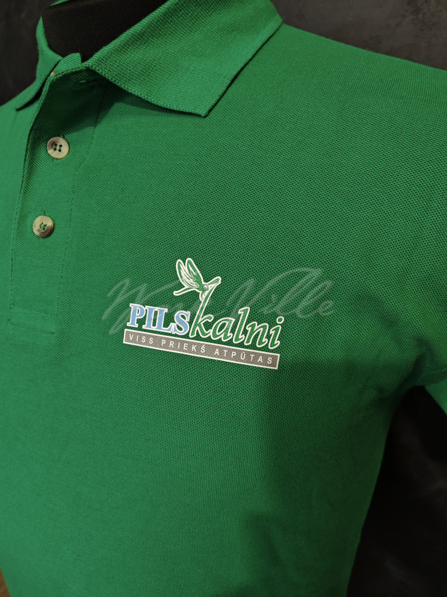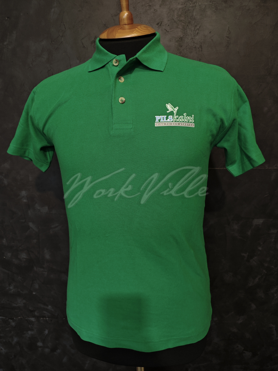 Легкое поло в зеленом цвете с брендингом PilsKalni.