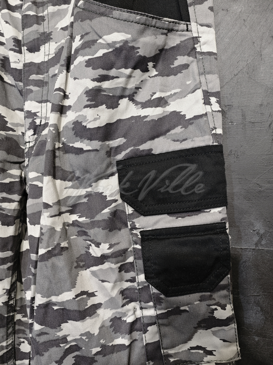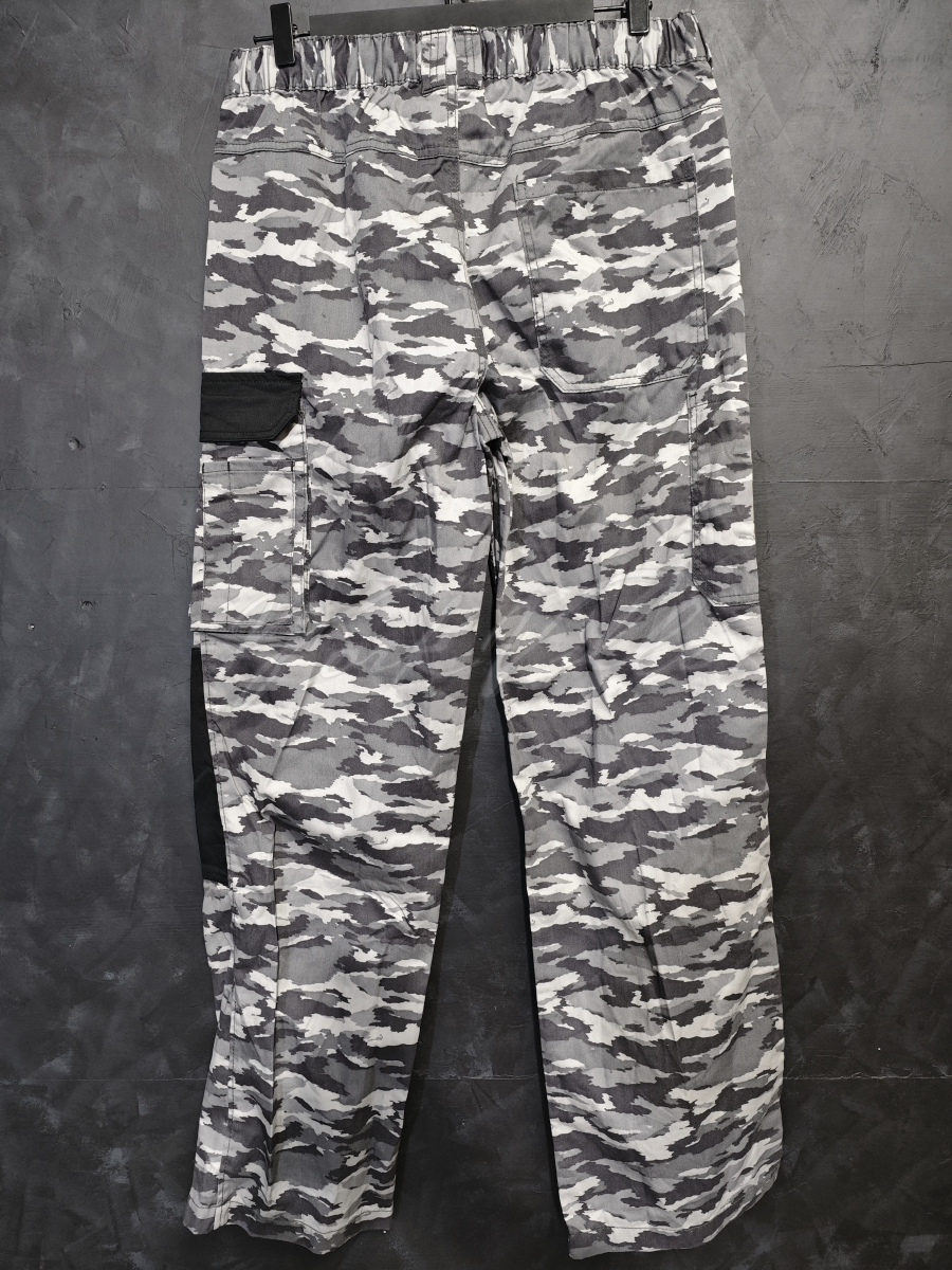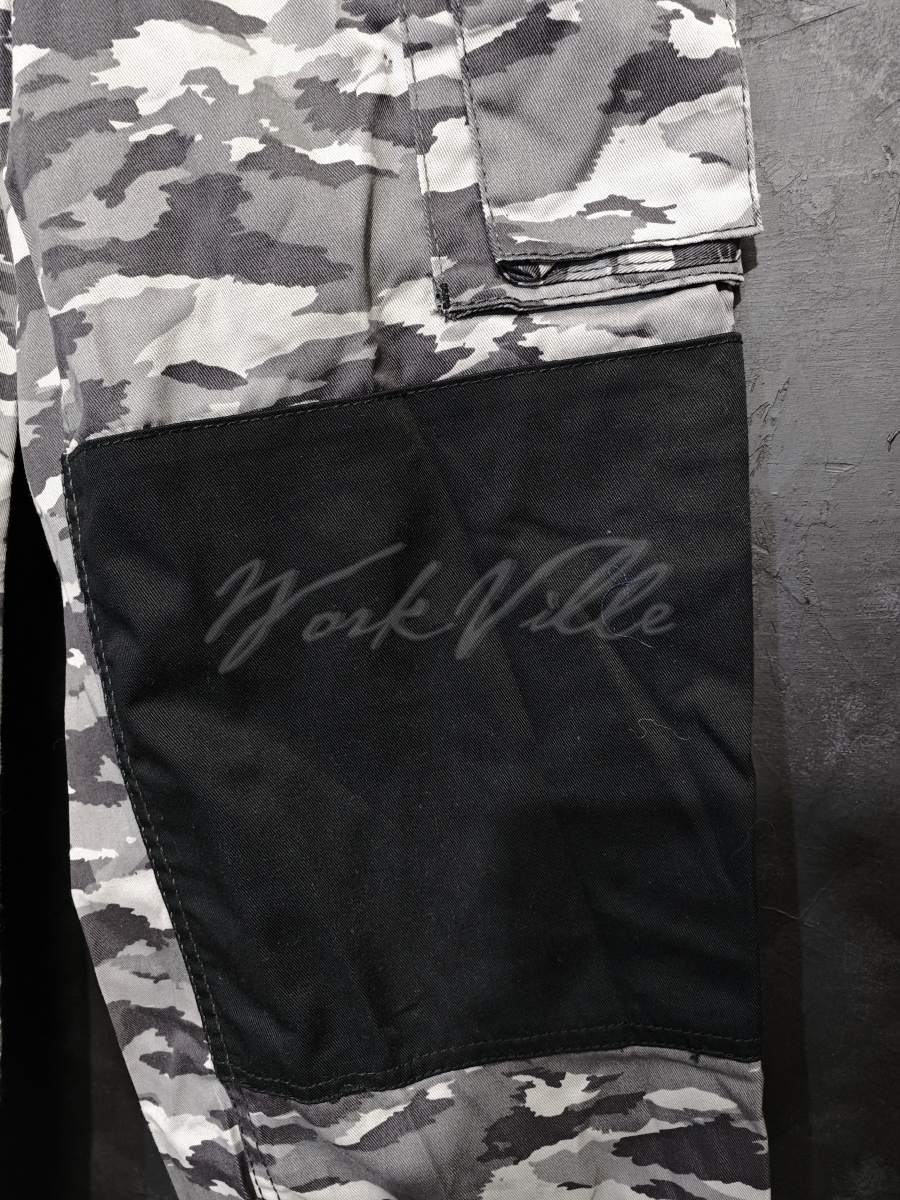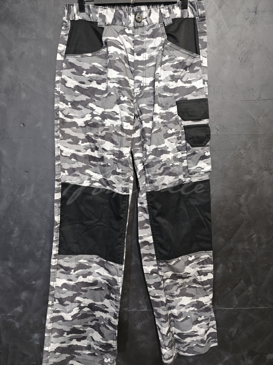 Рабочие брюки Parkside с серо-черным камуфляжным рисунком и множеством карманов.