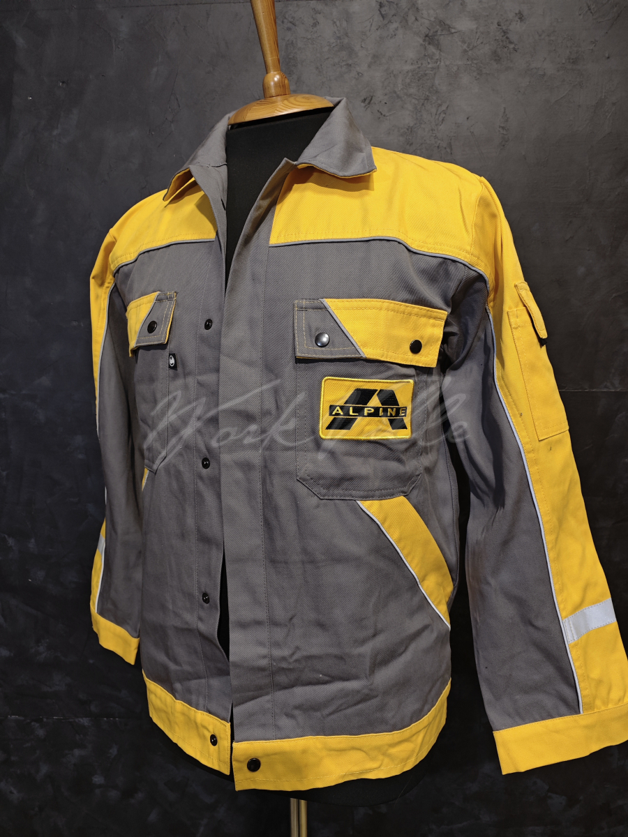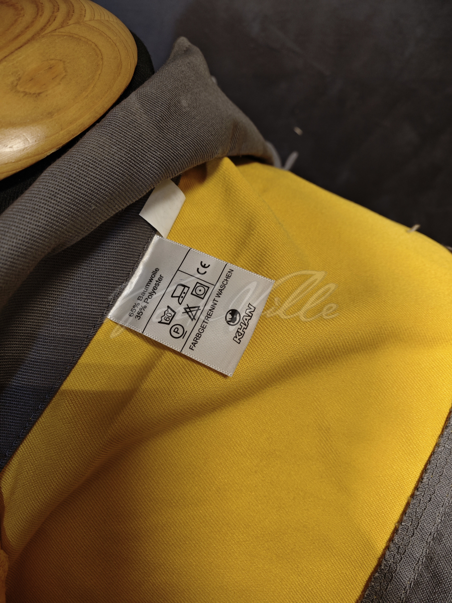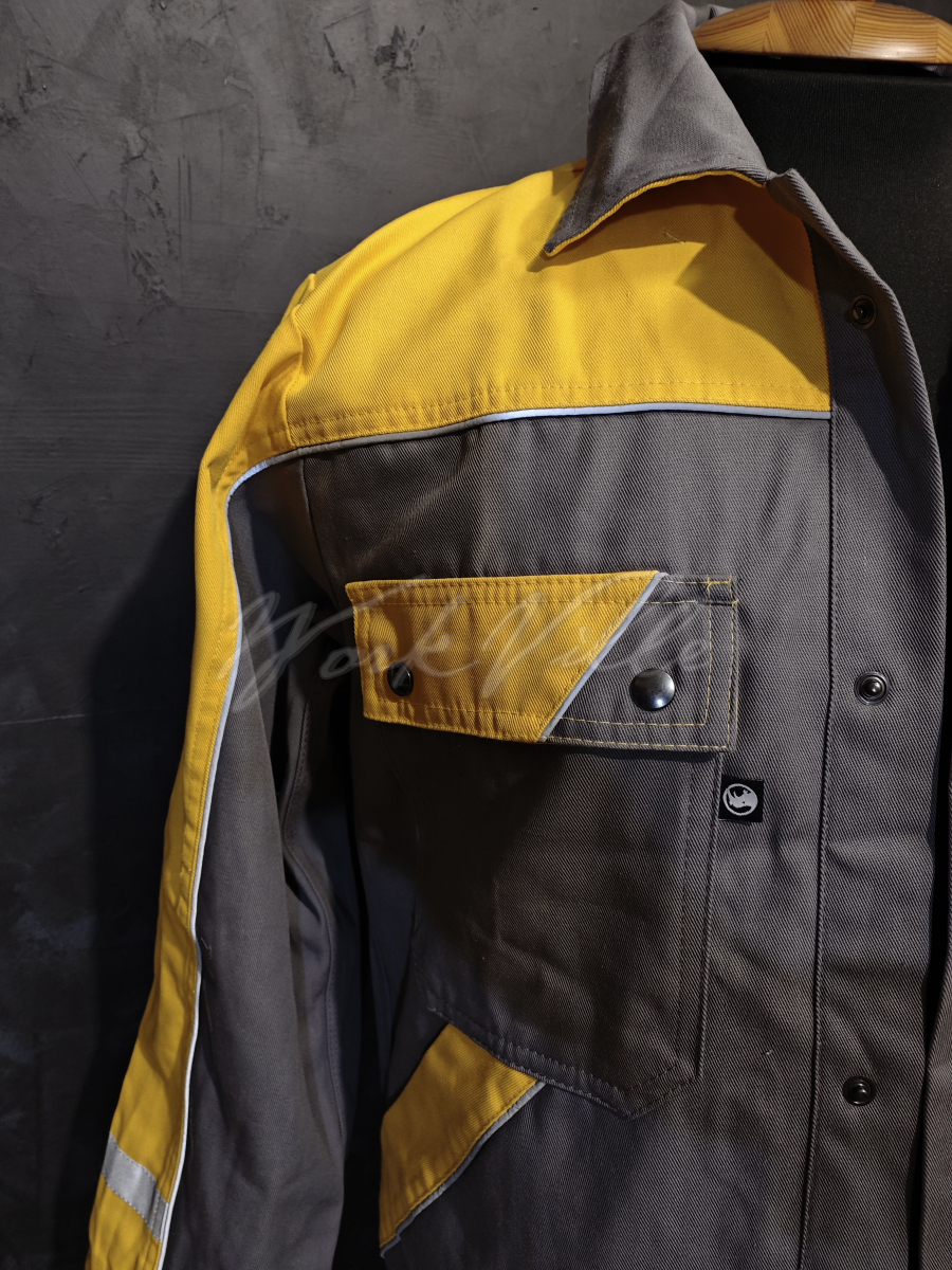 Рабочая куртка немецкого бренда специализированной одежды Khan серая с желтыми вставками.