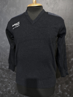 Пуловер черный с V-образным горлом и темно-синими накладками. подробнее